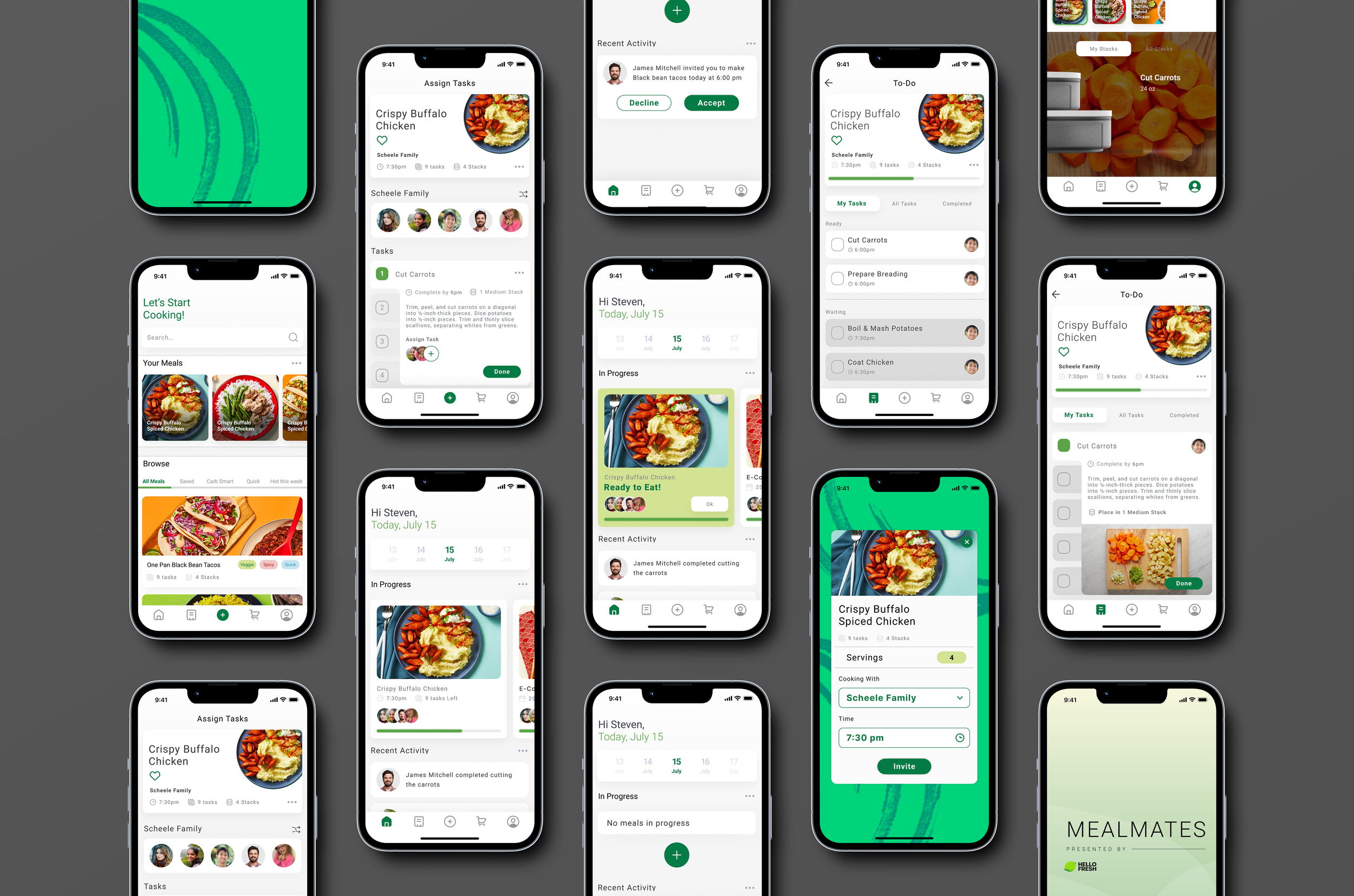I created multiple versions of the Meal Mates app and recipe detail views so I could test ideas around the ways family members might engage with each other and manage their progress through the app. I also created screen flows for family progress tracking and conceptualized a way for individuals to track where their families are in their progress.