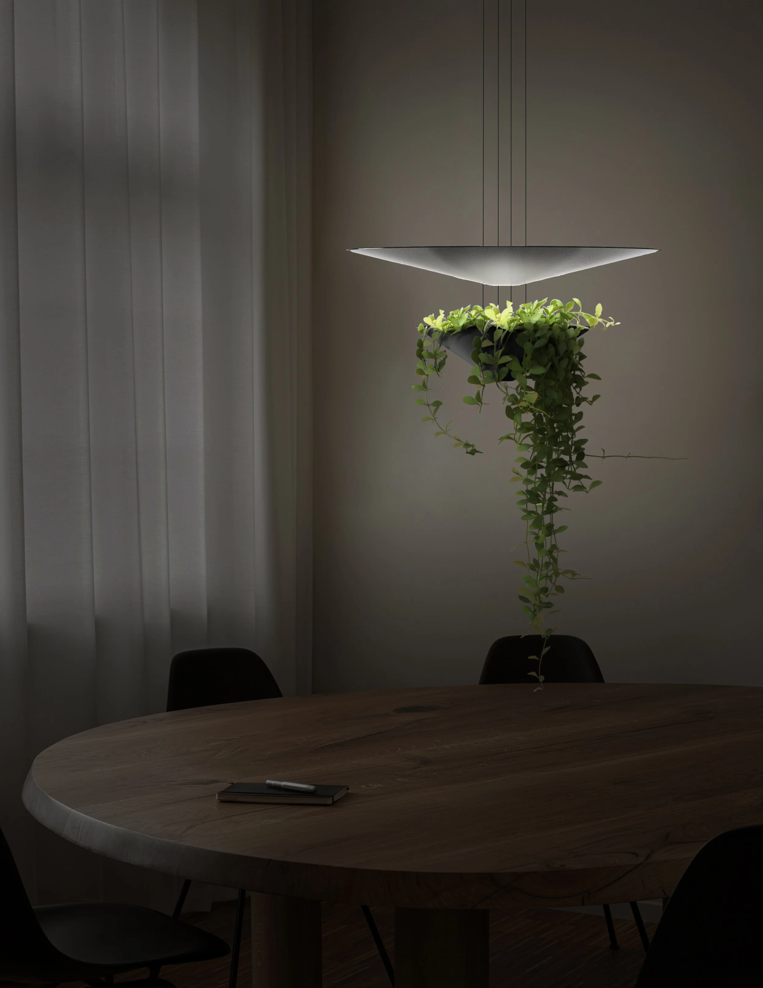 An indoor hanging hydroponic garden that doubles as a pendant light designed for small space living